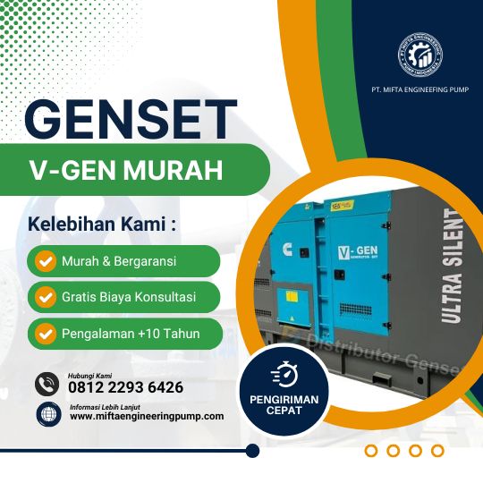 PT. Mifta Engineering Pump adalah distributor dan supplier terpercaya untuk produk Genset V-GEN di Indonesia. Kami menyediakan berbagai tipe genset V-GEN yang dirancang untuk kebutuhan daya cadangan di sektor industri, komersial, dan residensial—mulai dari genset portable hingga genset diesel berkapasitas besar. Genset V-GEN dikenal dengan efisiensi bahan bakar, performa mesin yang stabil, serta kemudahan dalam perawatan dan pengoperasian. Dengan dukungan tim teknis yang profesional serta ketersediaan stok yang lengkap, PT. Mifta Engineering Pump berkomitmen memberikan solusi genset V-GEN yang andal, tahan lama, dan sesuai dengan kebutuhan pelanggan. Kami juga menyediakan layanan konsultasi teknis, instalasi, pengiriman cepat, dan dukungan purna jual untuk memastikan kenyamanan dan kepuasan pelanggan secara menyeluruh.