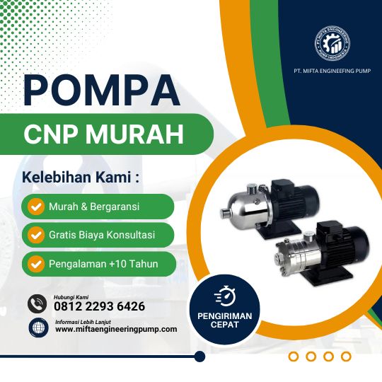 PT. Mifta Engineering Pump adalah distributor dan supplier terpercaya untuk produk Pompa CNP di Indonesia. Kami menyediakan berbagai jenis pompa CNP untuk kebutuhan industri, komersial, hingga domestik, termasuk pompa centrifugal, multistage, submersible, dan booster pump dengan kualitas dan teknologi internasional. Dengan dukungan tim teknis yang berpengalaman serta ketersediaan stok yang lengkap, PT. Mifta Engineering Pump berkomitmen memberikan solusi pompa yang efisien, handal, dan sesuai dengan kebutuhan pelanggan. Kami juga menyediakan layanan konsultasi produk, pengiriman cepat, serta dukungan purna jual untuk memastikan kepuasan optimal dalam setiap transaksi.